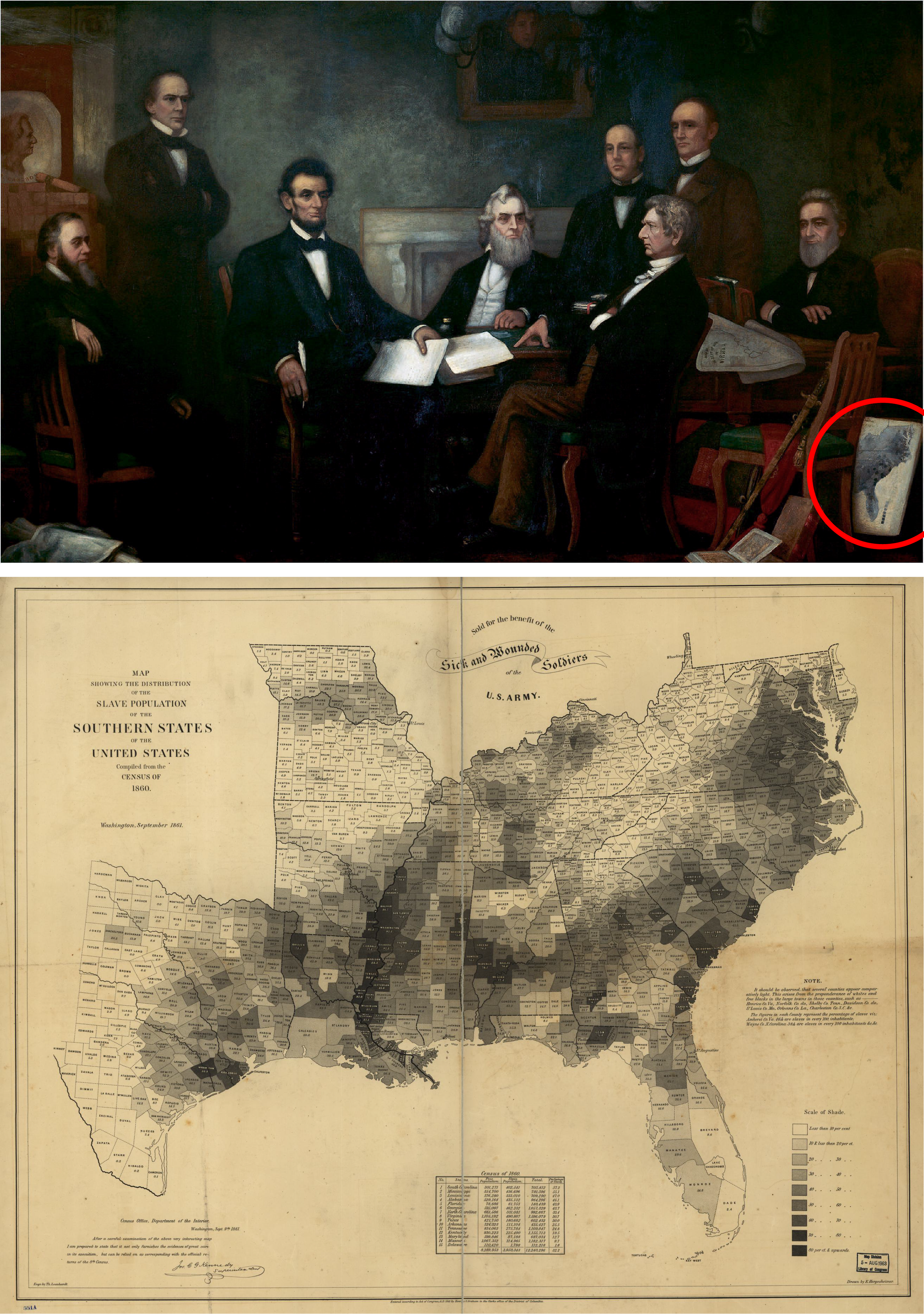 Carpenter had meticulously reproduced a map showing the geography of enslavement at the time of the 1860 census. Lincoln consulted the map regularly throughout the war, with Carpenter reporting that it “usually leaned against a leg of his desk or table and bore the marks of much service . . .” Every county in the South is shaded to show the enslaved as a percent of the total population. The darkest counties were over 80 percent enslaved, while slaves made up less than 10 percent of the counties left blank . . . The map is dated September 1861, and the note at the top reveals its allegiance: “Sold for the benefit of the Sick and Wounded Soldiers of the U.S. Army”—the army of the North.