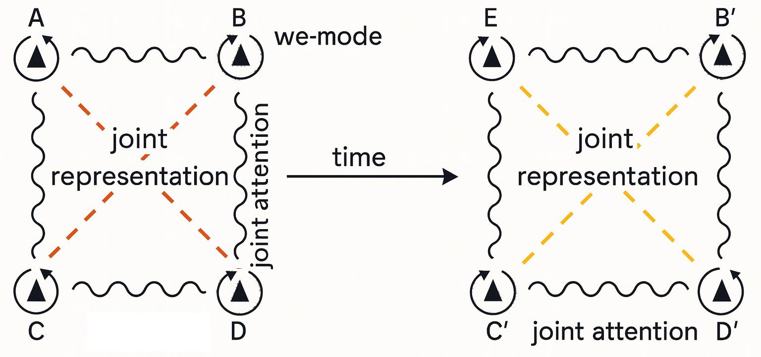 Let’s start with the left half of the diagram. There are four individuals, A, B, C, and D—though a minimum of two is required for joint attention. In humans, joint attention is not just ‘sharing’ attention on a particular object in the environment. Comparative primate research (PDF) indicates that gaze following is widespread across primates—including lemurs and monkeys—and appears in great apes in more sophisticated forms such as geometric gaze following (tracking gaze around barriers) and “checking back” when no target is found. Human joint attention, on the other hand, is much more sustained and robust. Individuals A, B, C, and D in our little group may share attention to an element of objective reality, like a certain tree in their environment, or to an element of subjective reality, like a group member’s pain. And when they do, they engage what the Friths call ‘we-mode,’ shown as an individual process in the diagram: